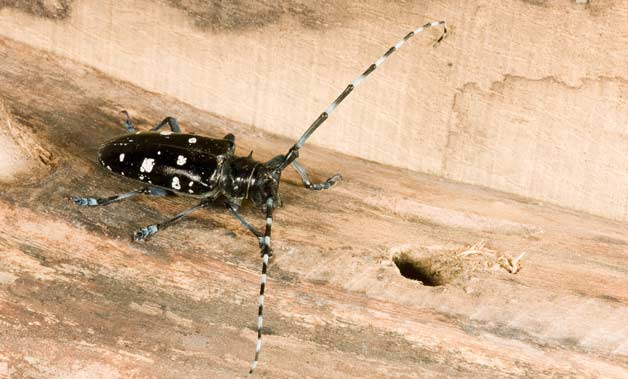 The summer months are the best time to spot the large black and white beetles as they emerge from trunks and branches, spread to other trees, and lay eggs.