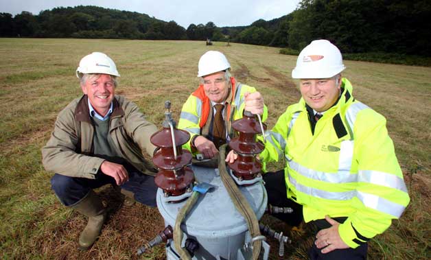 Transformers, poles and power lines have disappeared from the landscape. L-r Stephen Godwin-Austen, owner of Tilsey Farm, Michael Sydney, chairman of Surrey Hills Board, and Colin Barden, UK Power Networks’ head of South East network operations.