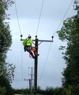 Going underground: linesman dismantling the power lines today at a Palmers Cross farm recently used by Hollywood.