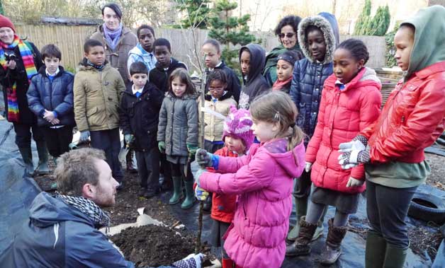 The first Core Blimey- public orchard- (Christchurch Primary School, in Wandsworth) being planted. 40 more public Core Blimey orchards are to be planted around London