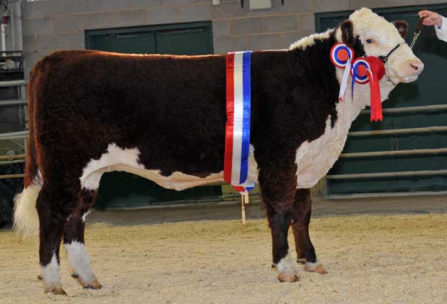 Taking the Grand Male Championship was 14 month old Dendor 1 Jethro from DE, ED & AL Jones, Caersws, Powys. The National Christmas Calf Show has been a good hunting ground for the Jones family taking the Supreme Championship in both 2010 & 2011. “Jethro” is another calf out of the successful ‘Molly family’, this time out of Dendor 1 Molly 26th and by stock sire Hawkesbury 1 Prosper. “Prosper” was bred by D & E Colledge, Hawkesbury Herefords, Coventry, Warwickshire, who had success in their own right, being awarded the Reserve Grand Male Championship with Hawkesbury 1 Vespa. “Vespa”, a nine month old bull calf, is out of former Royal Show Champion Hawkesbury 1 Vollie-Vont and by Dorepoll 1 499 Emperor, the 2008 Christmas Calf Show Supreme Champion.