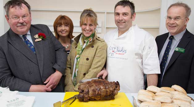 (Left to right) Royal Bath and West of England Society administrator Paul Hooper, Ladies in Beef co-founders Jilly Greed and Minette Batters, chef Glyn Halford and R.A.B.I. chief executive Paul Burrows at the launch of the attempt to break the world record.